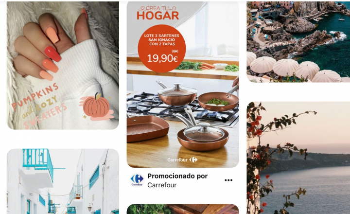 Por eso se ha vuelto fundamental para las marcas y es habitual navegar por el tablero de inicio y encontrarse contenidos patrocinados. Pueden redirigir tanto a un tablero de la marca como directamente a la web, para acelerar la conversión de compra.