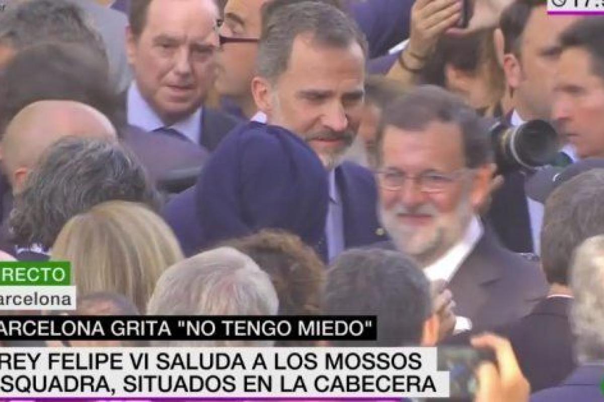 Poco antes de las 18:00 horas, el presidente del Gobierno, Mariano Rajoy, y el rey Felipe VI llegaban a la manifestación contra el terrorismo de Barcelona.