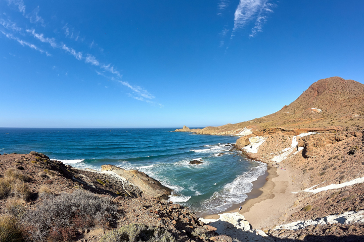 Situada en Cabo de Gata, esta pequeña cala rocosa rodeada de acantilados es un espectáculo de la naturaleza. El rey de Rajá es el silencio y el espacio no es problema: podrás elegir dónde colocarte y disfrutar de las aguas del Mediterráneo.