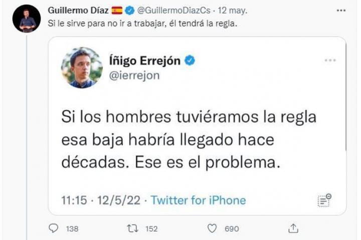 Díaz recogió ese mensaje y escribió, en referencia a Errejón: “Si le sirve para no ir a trabajar, él tendrá la regla”. Lo que muchos no vieron venir ha sido la respuesta del propio diputado de Más País: “Guillermo, cuando nos cruzamos por el Congreso eres más educado”.