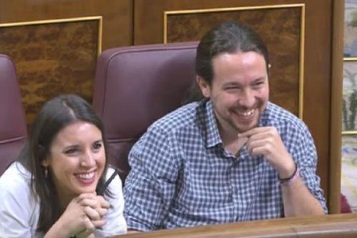 El problema es que esa imagen, la de Iglesias y Montero riéndose, no se corresponde con ese instante, sino con otro muy posterior: cuando Rajoy sacó Venezuela para responder por la corrupción. Puedes comprobarlo en este vídeo a partir del minuto 5:05.
