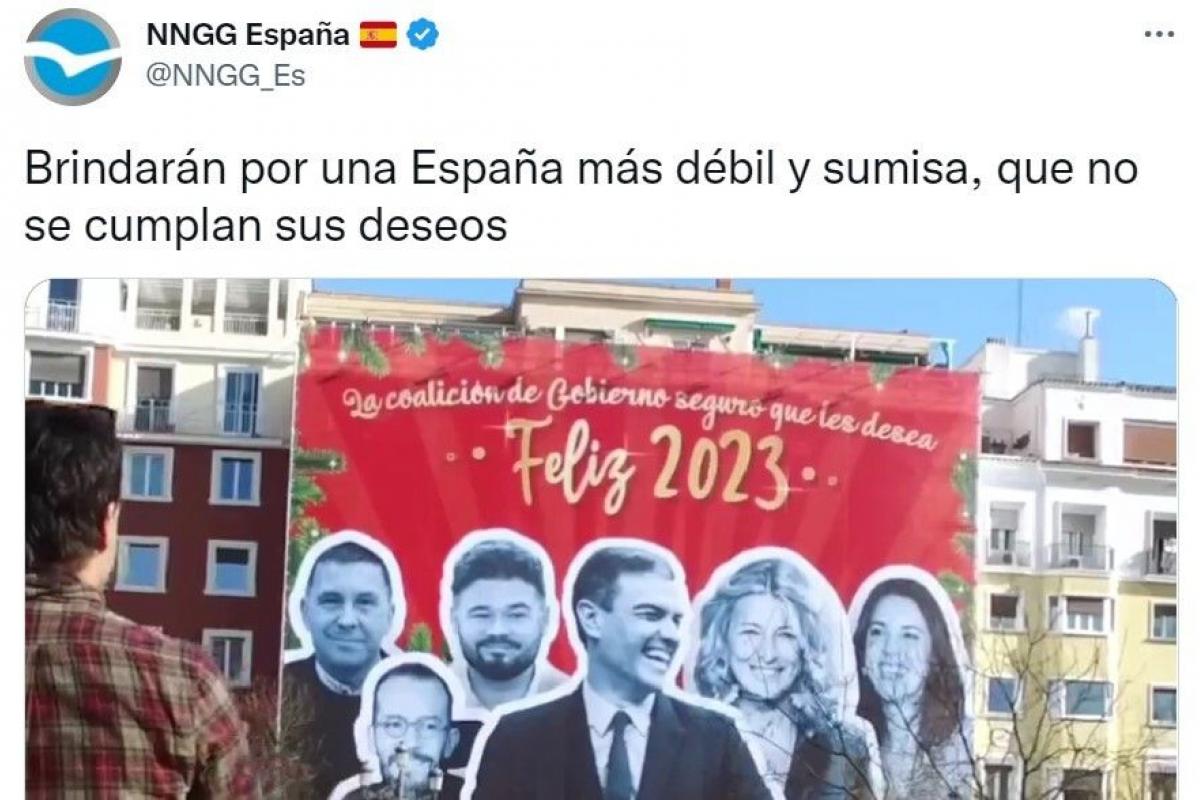 “La coalición de Gobierno seguro que les desea Feliz 2023”, se puede leer en el mensaje. Nuevas Generaciones, además de compartir un vídeo del despliegue de la lona, escribió que “brindarán por una España más débil y sumisa” y pidió que “no se cumplan sus deseos”.