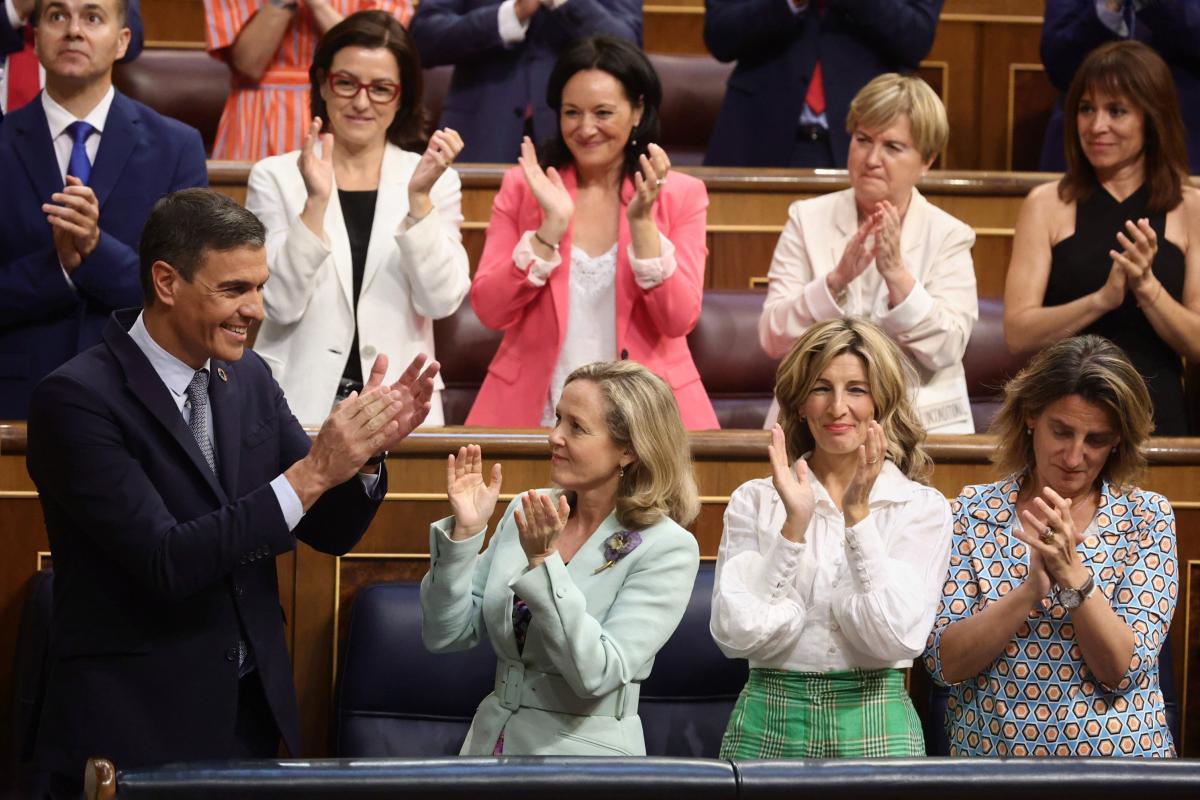 Pedro Sánchez recibe aplausos de la bancada del PSOE y sus tres vicepresidentas.Europa Press News via Getty Images