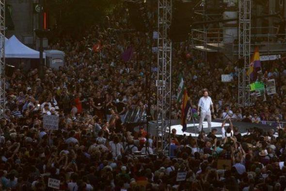 Una multitud acompaña la concentración de la formación morada en el centro de Madrid.