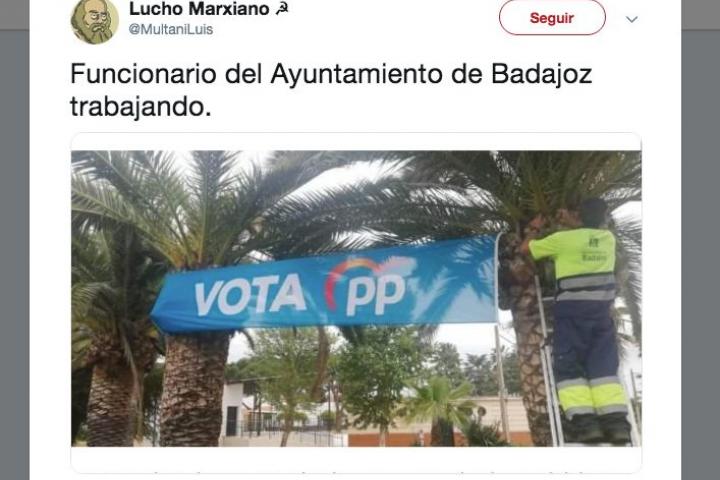 Sorprendente la imagen que se pudo fotografiar en un parque de Valdebótoa, una pedanía de Badajoz, donde se vio a un empleado del Ayuntamiento colocando un cartel con el lema ‘Vota PP’ en una de las palmeras del lugar.