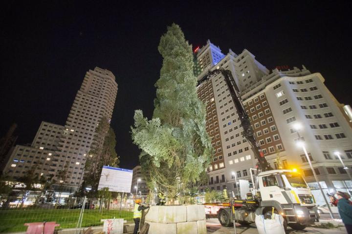 La pasada madrugada llegaba a Plaza España el gran abeto natural de 18 metros y 1,5 toneladas que “iluminará la Navidad” con 150 cordones luminosos de microlámparas que suman unos 1.800 metros y 27.000 puntos de luz.