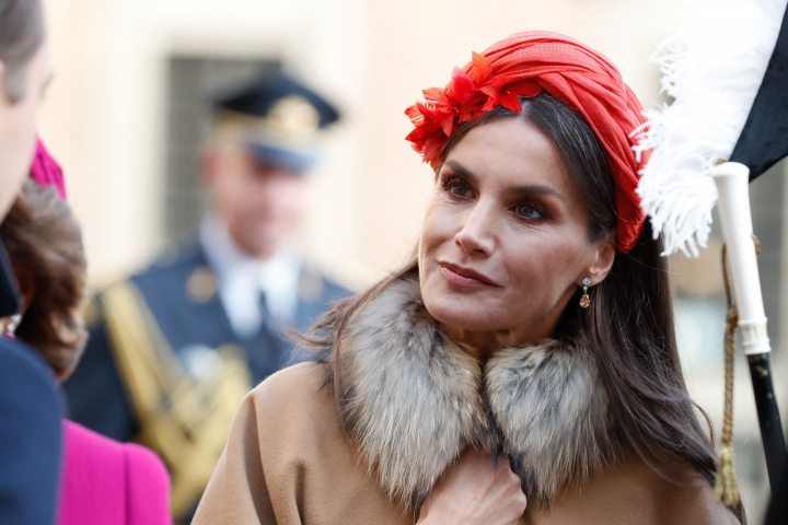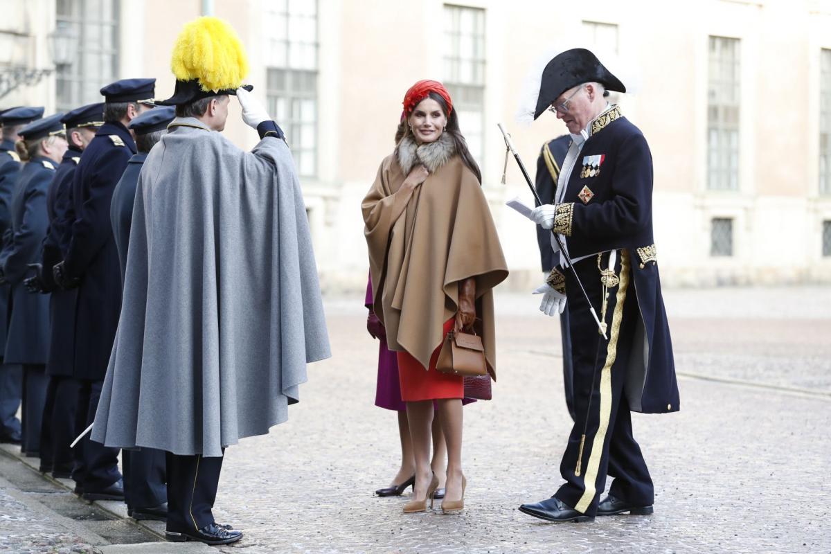 Se trata del cuello de pelo que lució en los saludos con los reyes suecos Carlos Gustavo y Silvia, que dieron la bienvenida a los monarcas españoles en su viaje de Estado al país nórdico, que arrancó con un paseo en carroza de caballos de época de los dos matrimonios por parte del casco histórico de Estocolmo hasta el interior del Palacio Real.