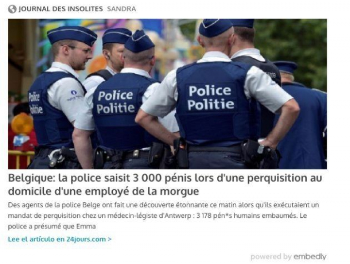 "La policía belga incauta 3.000 penes durante el registro en la casa de un empleado de una morgue". Este titular, que da para más de 3.000 chistes, no es cierto, por desgracia para muchos usuarios de Twitter.