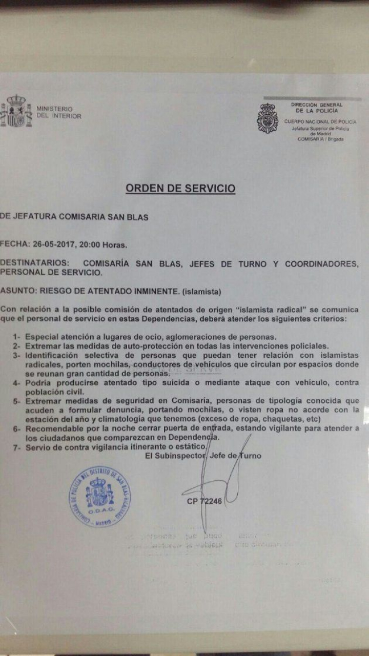 En él se especifican siete "criterios" para los agentes de Policía y el personal de servicio de la comisaría, como "especial atención a lugares de ocio y aglomeraciones de personas", "auto-protección en todas las intervenciones policiales", "identificación selectiva de personas que puedan tener relación con islamistas radicales".