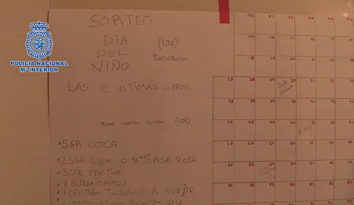 En uno de los registros practicados, los agentes localizaron una plantilla en la pared donde los clientes se apuntaban y participaban para ganar una ‘narcocesta’ en el caso de acertar las dos últimas cifras de los sorteos de Navidad o de El Niño.