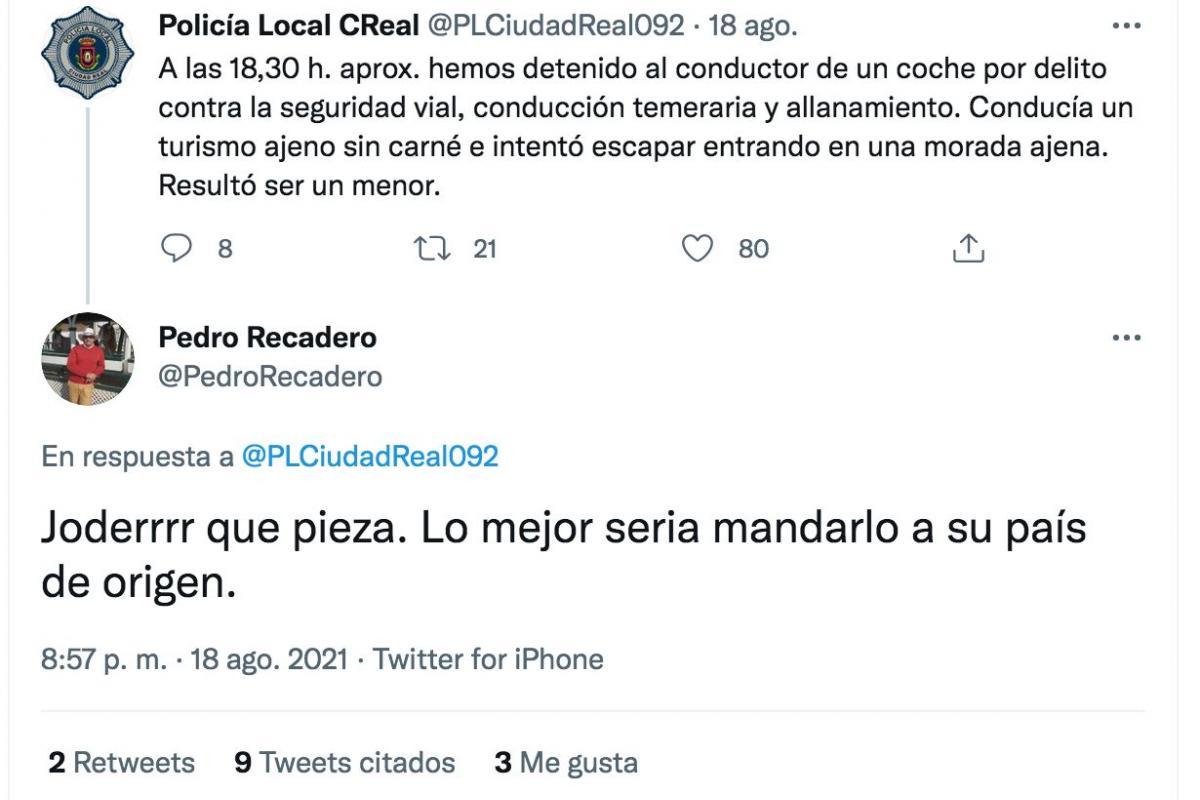 Un mensaje al que un usuario llamado Pedro Recadero contestó lo siguiente: “Joder, qué pieza. Lo mejor sería mandarlo a su país de origen”.