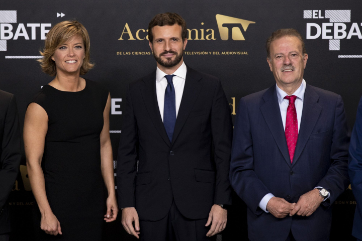 Pablo Casado también se ha arrancado con las fotos y con un estilismo muy parecido al de Rivera, aunque más tradicional. Traje azul oscuro, impecable camisa blanca, barba y bien de polvos de sol. El líder del Partido Popular abroncó al resto de candidatos, mucho más contundente que en otras ocasiones.