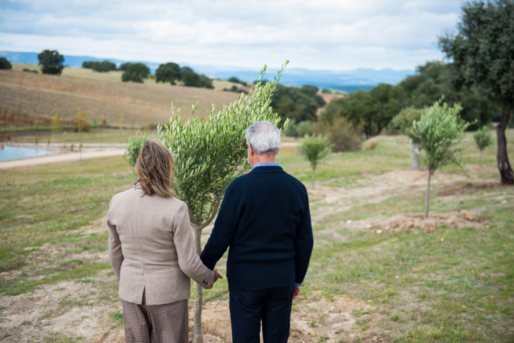 “Es el primer bosque donde depositar las cenizas que existe en España de forma 100% ecológica y sostenible. Y que está 100% en terreno rústico, en un bosque de verdad y no anexo a ningún cementerio. Porque hay cementerios que están intentando cosillas parecidas a lo que hacemos nosotros. Por ejemplo, un jardín para esparcir la cenizas o que en los árboles del propio cementerio se pueda hacer algo... ”, cuenta Ana González Alonso, una de las creadoras de este especial bosque que enseguida explica por qué ellos no querían estar ahí. “Ahí estás pegado a algo que nosotros no queremos: panteones, gárgolas, mármoles, criptas, nichos… En un cementerio convencional ves mucha tristeza y desigualdad, de los pequeños nichos a los grandes panteones. Aquí todo el mundo es un árbol y el árbol es el símbolo de la vida que esa persona ha vivido: es cambiar una vida por otra. Este es un terreno que es campo campo, desde el que solo ves la sierra de Gredos, Guadarrama, viñedos, encinas, olivares… Aquí vuelves a pertenecer a la tierra y eres igual que el resto. La única diferencia es que el árbol haya crecido más o menos, o que hayas elegido un árbol ya plantado con la copa más grande, o un madroño arbustivo, o un olivo centenario o más pequeñito...”, detalla sobre la concepción de este proyecto.