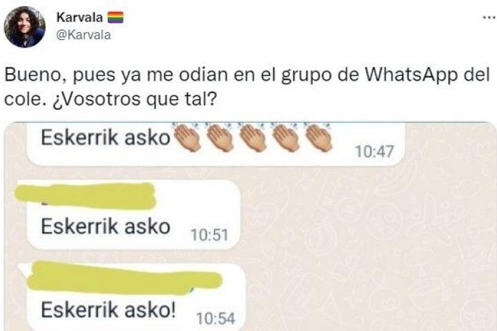 Con un tuit que supera ya los 13.300 ‘me gusta’ en menos de 24 horas, esta madre vio como todos los integrantes del grupo daban las gracias por un asunto anterior. “Eskerrik asko” (gracias en euskera), se leyó continuamente en este grupo. Cada mensaje decía lo mismo.