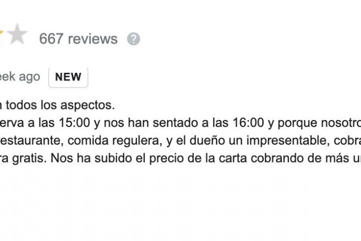 “Decepcionante en todos los aspectos. Hoy teníamos reserva a las 15:00 y nos han sentado a las 16:00 y porque nosotros nos hemos enfado. Mala gestión del restaurante, comida regulera y el dueño un impresentable, cobrando una ronda que supuestamente era gratis. Nos ha subido el precio de la carta cobrando de más una botella de vino. No volveré”, dice la reseña en cuestión que tiene una estrella de cinco, es decir, la peor nota posible.