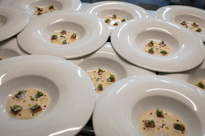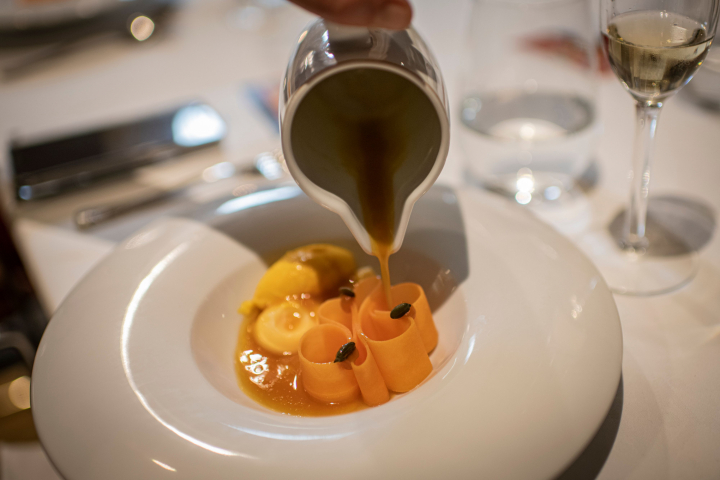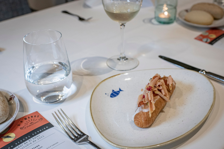 “Empezamos con un chupito de gazpacho clarificado sobre el que colocamos una tortita con puntos de guacamole y crema de maíz blanco, seguimos con portobello confitado con una crema sorpresa en el centro; luego, merengue de tomate seco con reinterpretación de mozzarella y pesto”. El cuarto aperitivo fue caballa marinada con flor de nabo daikon, y un clásico de ‘La Salita’ antes de pasar a los primeros, la berlina rellena con crema de huevo frito como un pastel, “que preparamos friendo el huevo en un aceite infusionado con las pieles de las anguilas y rematamos con una salsa de anguilas”.