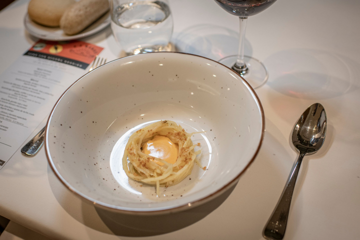 El Sarandonga es como dice la canción arroz con bacalao, aunque Begoña Rodrigo prepara el arroz en texturas junto con la coliflor en crema y el pescado desalado con tanto arte que dan ganas de tararear el estribillo recuperado por Lolita. La alcachofa confitada con tartar de gamba roja y maíz de Alcarazo es uno de los platos del Parador que se vistió de fiesta, tal y como exigía la ocasión. Los espagueti de chirivía, kimchee y leche cruda, simulando la clásica carbonara son uno de los platos vegetales por los que Begoña Rodrigo ha apostado en su cocina de Russafa.