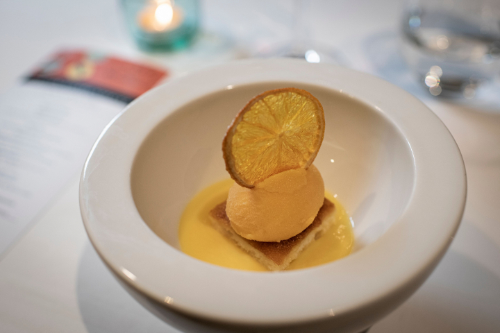 Los postres coincidían cromáticamente aunque no podían ser más distintos y complementarios a la vez. ‘Nuestro postre de las naranjas’ es una creación de José Antonio Alcarazo, que se ha ido incorporando a otros paradores tras su buena acogida. La naranja se presenta en texturas. “Sobre una crema ligera de naranja se apoya el bizcocho embebido en agua de azahar y caramelizado, con helado de naranja encima y crujiente de naranja”, explica el chef de El Saler.