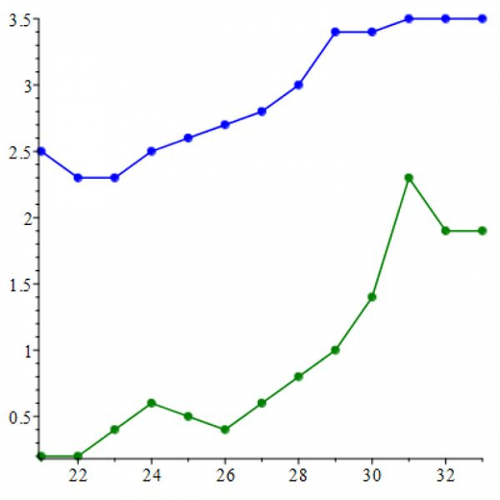 En la figura siguiente se muestra una comparativa de los porcentajes de mortalidad en China (línea azul) y fuera de China (línea verde) en las actualizaciones del ministerio de la 21 en adelante, que es a partir de la cual se empiezan a dar datos comparativos China versus fuera de China.