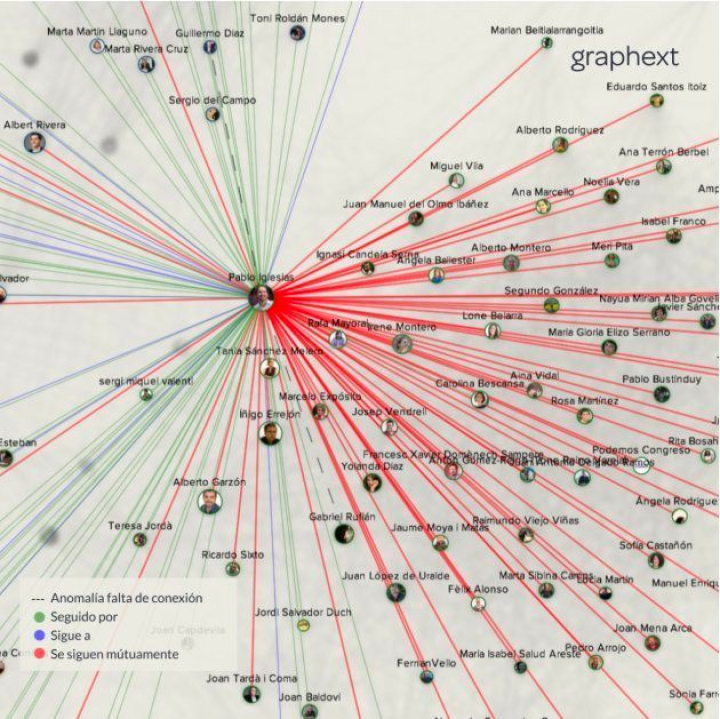 Si miramos el grafo, el entorno de Rufián o bien se sigue mutuamente con Pablo Iglesias (en rojo) o bien sigue al líder de Podemos pero éste no les corresponde (en verde). No es el caso de Rufián, que se representa con la línea discontinua como anomalía, lo que quiere decir que la herramienta entiende que sería lógico que siguiera a Pablo Iglesias. Y viceversa.