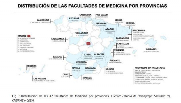 El diagnóstico es claro: en España hay un exceso de facultades de Medicina. Es la denuncia que hacen desde el Consejo Estatal de Estudiantes de Medicina (CEEM) y la Conferencia Nacional de Decanos de Facultades de Medicina (CDNMFE). Critican que la proliferación de facultades ha sido espoleada por decisiones políticas o económicas y no por criterios demográficos y sanitarios, lo que a su juicio va en detrimento del sistema de salud y supone un despilfarro de recursos.