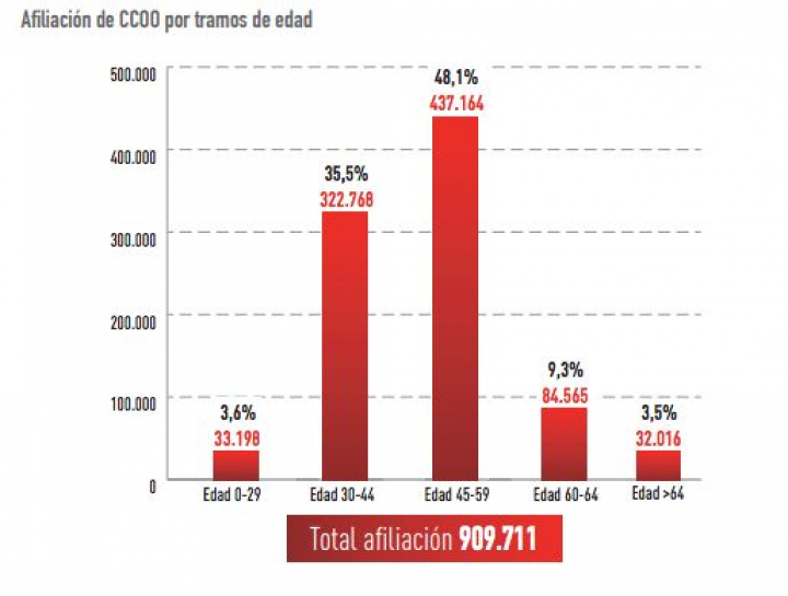 Muchas de estas personas que se marcharon fueron jóvenes, ya que el desempleo en este colectivo superó el 50% durante varios años. “Durante el periodo 2013-2016, los jóvenes han sido uno de los colectivos más afectados por la crisis, y su consecuencia ha sido su bajo peso en el conjunto de la afiliación. El tramo comprendido entre los 30 y los 59 años representa el 83,6% de la afiliación”, reconoce CCOO en su memoria de actividad.