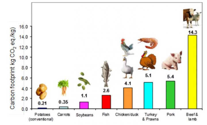 La profesora Azapagic ha creado una gráfica muy práctica que compara la huella de carbono de diferentes alimentos para que la gente pueda tomar decisiones informadas sobre su alimentación. En ella se muestra cuántos kilos de emisiones de dióxido de carbono se generan por kilogramo de comida.