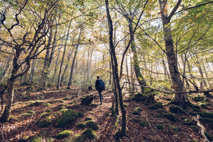 Ponemos rumbo a la belleza salvaje de Navarra para visitar el segundo hayedo-abetal más extenso y mejor conservado de Europa, justo después de la fotogénica Selva Negra de Alemania. Más de 17.000 hectáreas conservadas en estado casi virgen rodeadas por montañas como Ori o Abodi. Un auténtico lugar donde evadirse. Tupidos hayedos, pastizales, abetos y frescas aguas como las del río Irati pintan un paisaje de colores vivos que se transforma con cada nueva estación. Todo un tesoro natural donde vivir multitud de sensaciones, ¡justo lo que estábamos buscando! Estamos más que listos para experimentar ese encuentro a solas con la naturaleza, sentir el rumor salvaje del agua entre hayas y abetos, el frescor del embalse de Irabia, el sonido huidizo de los animales y el olor a los frutos del bosque y la suavidad del manto de hierba que cubre esta joya de los Pirineos. Zapato cómodo y cámara en mano, es el momento de recorrer cualquiera de los senderos balizados que recorren el bosque. Para llegar hasta ellos puedes elegir entre los dos accesos a la Selva de Irati: por su costado occidental desde Orbaizeta y por el oriental desde Ochagavía, donde además encontrarás el Centro de Interpretación, fundamental para informarse de todo lo necesario sobre la Selva de Irati y su entorno. Y si a este bosque de cuento le faltaban los personajes, ya los tenemos aquí. Cuenta la leyenda que aquí habitan personajes legendarios como las brujas y lamias que aprovechan la niebla para pasear el espíritu de doña Juana de Labrit -reina hugonote envenenada en París - y hacen desaparecer a quienes se encuentran a su paso. O Basajaun, el señor del bosque, de alta estatura, larga cabellera y fuerza prodigiosa. Y una advertencia final, si te lo cruzas por el camino, no huyas, hay que obedecer sus órdenes para que se transforme, gustosamente, en tu guía protector durante tu visita al bosque.