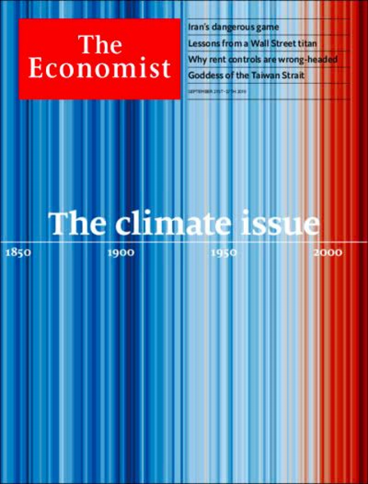 La idea es sencilla pero impactante: la publicación ha llenado su portada de franjas de colores que representan la temperatura media de la Tierra año a año desde 1850 hasta nuestros días.