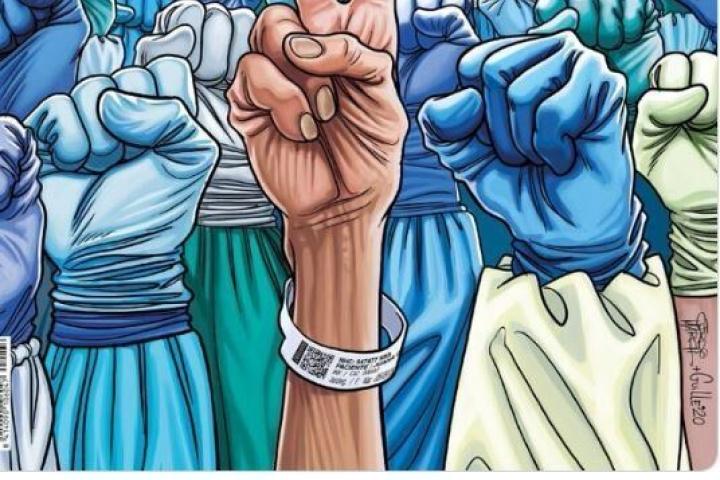 La publicación ha optado esta vez por una primera plana potente pero que se sale de lo habitual. En el dibujo se ven un montón de puños en alto que corresponden con los sanitarios. Y, en primer plano, el brazo de un enfermo haciendo la señal de la victoria.