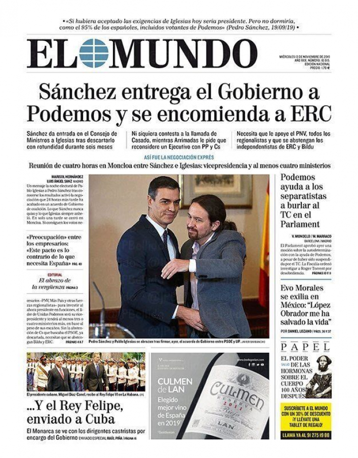 Portada del diario 'El Mundo' del 13 de noviembre de 2019.EL MUNDO