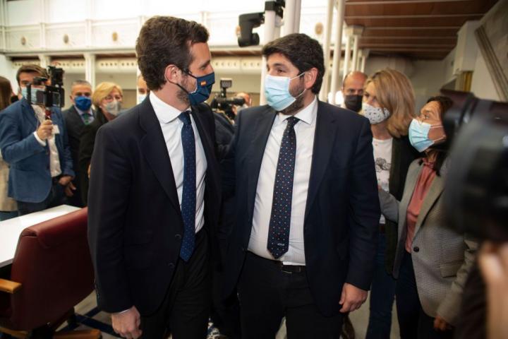El líder del PP, Pablo Casado (izq) y el presidente de Murcia, el popular Fernando López Miras, el 18 de marzo, en la Asamblea regional.Europa Press via Getty Images