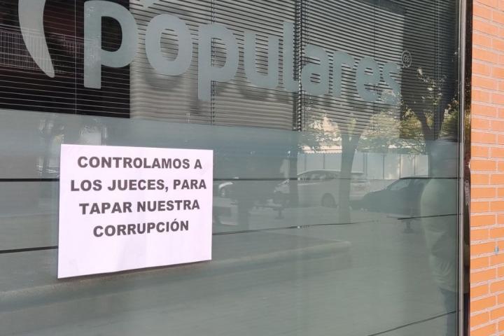 El PP ha denunciado que su sede en Huesca ha amanecido este lunes con carteles en su fachada donde se podía leer: “Controlamos a los jueces, para tapar nuestra corrupción”.