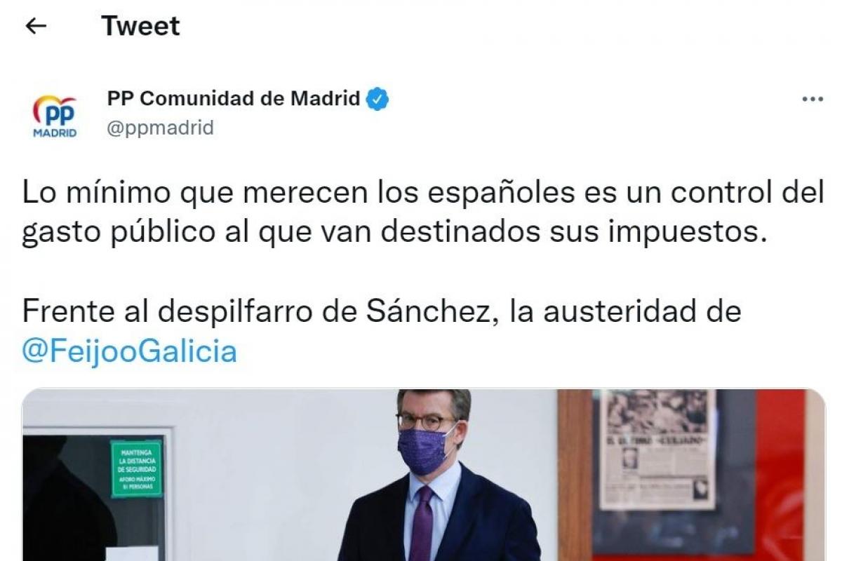 El Partido Popular de la Comunidad de Madrid ha compartido este domingo un mensaje en redes sociales en el que reclamaban al Gobierno de España un “control del gasto público”.