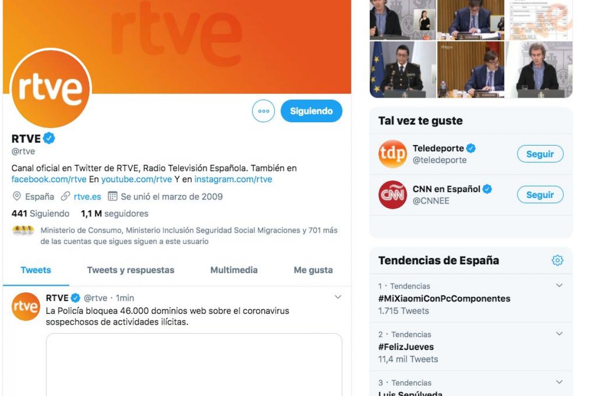 Una pregunta a la que RTVE responde contestando lo obvio: que eso no es cierto, que ni la cuenta de RTVE ni RTVE es quien decide qué otras cuentas se sugiere seguir y que eso es un algoritmo que determina Twitter en función de determinados intereses del usuario.