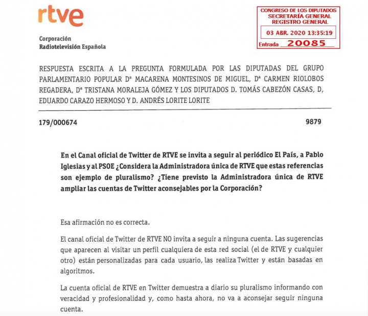 Críticas al PP por esta pregunta en el Congreso sobre la cuenta de RTVE en Twitter: "Qué bochorno"