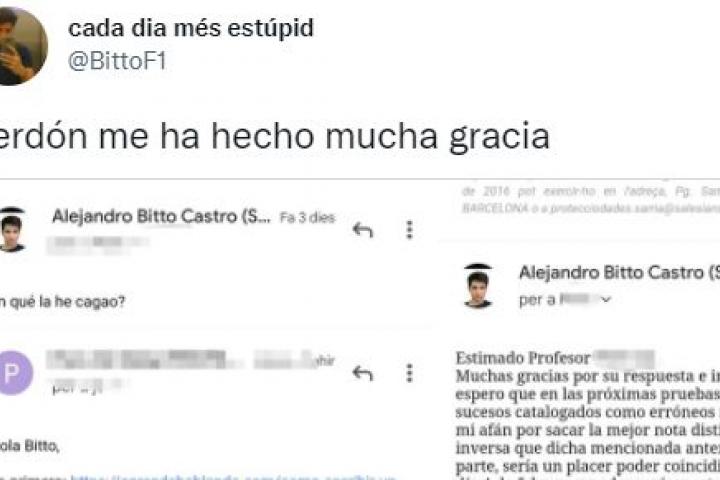 La última conversación entre un docente y un alumno que se ha hecho viral la ha compartido el tuitero BittoF1. Tras enviarle un correo a su profesor preguntándole textualmente “en qué la he cagado” en el examen, recibió la siguiente respuesta suya.