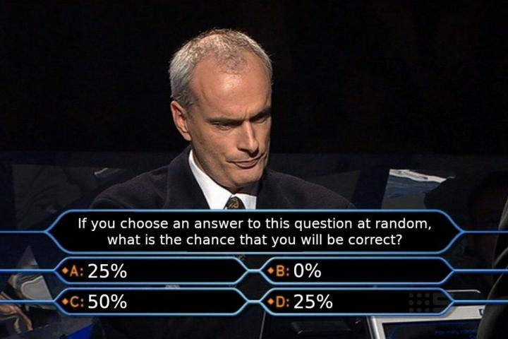 La cuestión es la siguiente: “Si escoges una respuesta a esta pregunta aleatoria, ¿cuál es la probabilidad de que sea correcta?”. Las cuatro opciones son: A) 25%, B) 0%, C) 50% y D) 25%.