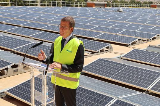 Feijóo, en una fábrica de instalaciones fotovoltaicas zaragozana, durante un discurso en el que defendió la energía nuclear.