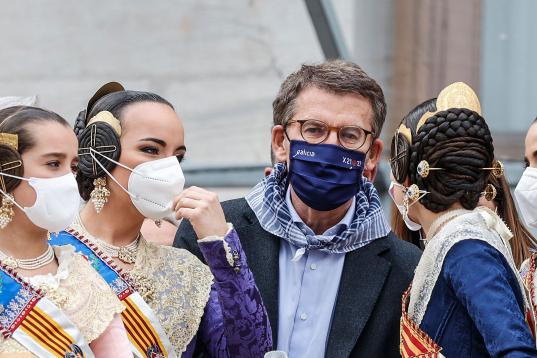 Feijóo conversa con varias falleras en un encuentro con afiliados del PP en Valencia.