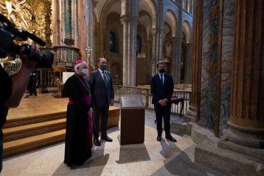 El arzobispo de Santiago, Julian Barrio Barrio; el presidente de Iberdrola, José Ignacio Sánchez Galán, ay Feijóo durante la inauguración de un nuevo sistema de iluminación en la Catedral.
