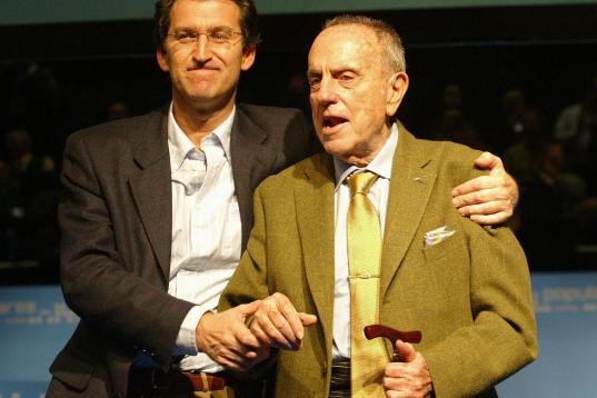 Feijóo agarrando al expresidente gallego Manuel Fraga, el 15 de enero 2006, durante el congreso del PP de Galicia en el que tomó el relevo de su maestro político.