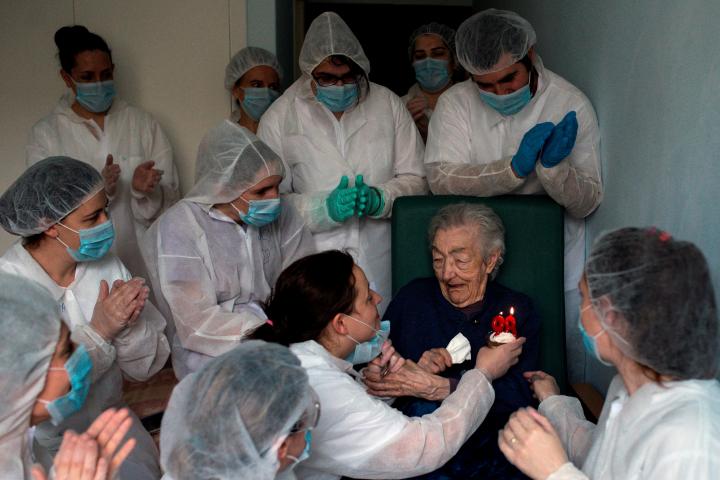 Brais Lorenzo ha ganado el premio a la mejor fotografía por la imagen titulada “Cumpleaños”, que ha sido difundida por los principales periódicos españoles y del resto del mundo. En ella, según recuerda el grupo de medios de comunicación Prisa, se ve a una mujer nonagenaria, Elena Pérez, celebrando sus 98 años dentro de una residencia para ancianos en Ourense, Galicia. El centro había sido el primer foco de coronavirus en la comunidad autónoma, pero ya estaba libre de enfermos en aquel momento.