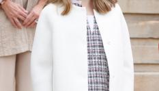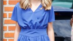 En ambas publicaciones, también se fijan en el vestido que lució la princesa, en tono azul klein de manga corta, escote pico y cintura fruncida. Leonor combinó el modelo con unos tacones destalonados en tono nude de Carolina Herrera y una mascarilla ‘corporativa’ con el escudo del centro.