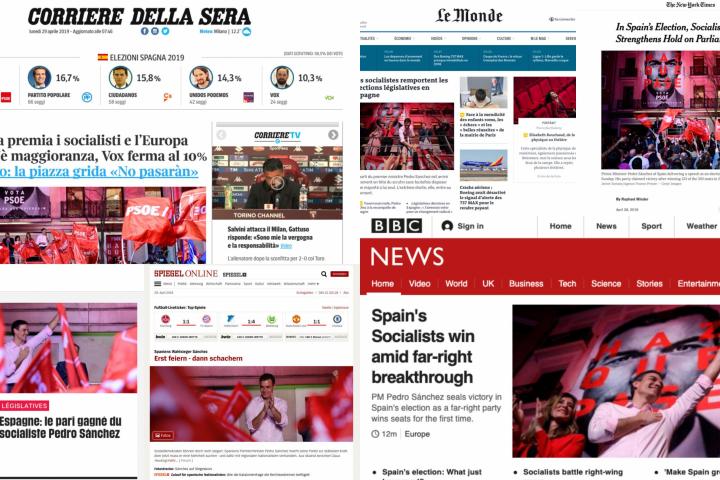 En Francia, Le Monde habla de una victoria importante para el PSOE, en consonancia con sus mejores previsiones: “Sánchez lidera claramente”. No obstante, añade: “No hay una mayoría clara. El bloque de izquierda, formado por socialistas y Podemos tendrá que encontrar aliados adicionales para llegar a los 176 diputados electos”. Habla de que el socialista tenía por delante la “reconquista” de España, jugando con el manoseado término de Vox y remarca una de las frases de la noche: “El futuro ha ganado y el pasado ha perdido”.