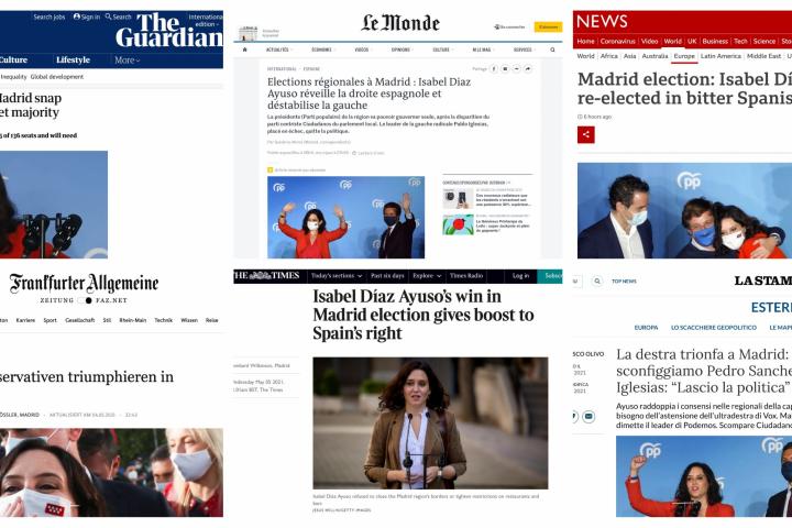 La prensa internacional ha entendido que las elecciones del 4-M en la Comunidad de Madrid no eran unas regionales más, sino que había que leerlas en clave nacional. De ahí la importancia que, especialmente los medios europeos, han dado a la cobertura de la victoria de Isabel Díaz Ayuso. “Aplastante”, “sin paliativos”, “arrolladora”, son algunos de los adjetivos que cosecha la popular.
