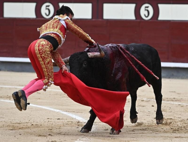 Caballero se tiró a matar volcándose sobre el morrillo y sin salirse de la suerte, enterrando el acero en lo alto pero quedando también colgado por un pitón, en lo que fueron unos segundos de tremenda angustia, más todavía cuando, una vez en el suelo, la sangre salía a borbotones por la pierna herida.