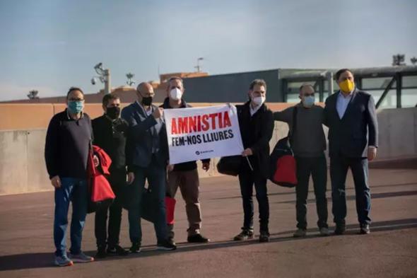 Los siete presos del procés que cumplen condena en la cárcel barcelonesa de Lledoners han salido de prisión este viernes mostrando una pancarta a favor de la amnistía, después de que la Generalitat les concedió este jueves el tercer grado, coincidiendo con el inicio de la campaña electoral del 14F.