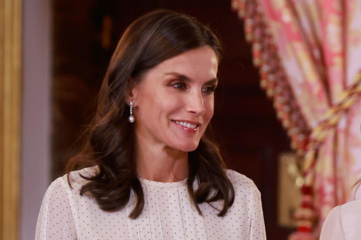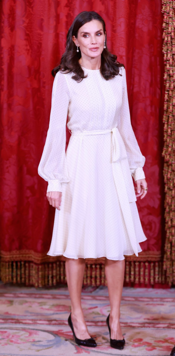 Letizia ha elegido un vestido blanco con diminutos lunares negros de Carolina Herrera para un almuerzo con el presidente y la primera dama de Paraguay en el Palacio Real. La pequeña de la familia había estrenado el diseño en las audiencias con los premiados de los Princesa de Asturias en octubre del año pasado en Oviedo.