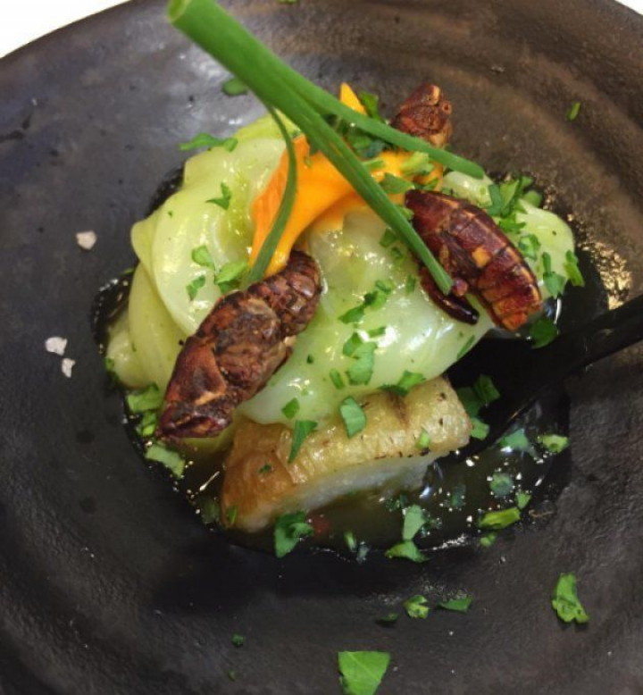 Ojo que salta la sorpresa. Un amable camarero posa delante de mí una especie de rollito vietnamita con una familia numerosa de gusanos dormitando encima de una hoja. Ahí me sentí como Timón en El Rey León, solo me faltó decir eso de 'viscoso pero sabroso'. Y trago de vino. Y otro pan de pico.
